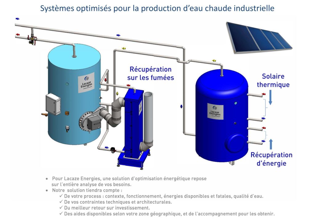 Qu’elles soient liées au fonctionnement de vos équipements de production ou aux rejets issus de votre activité, les sources d’énergies fatales sont nombreuses et surtout encore loin d’être valorisées, notamment dans le cadre de la production de chaleur. En effet, lorsque vos procédés industriels fonctionnent, une partie de l’énergie thermique produite n’est pas utilisée et va donc être rejetée. Cependant, récupérer et valoriser ces rejets de chaleur peuvent trouver leur application dans le cadre d’un préchauffage de fluides avec une récupération assurée par le biais d’un réservoir de stockage. Ce dernier aura alors pour vocation de concentrer l’énergie des différentes sources de chaleur localisées, pour la réinjecter dans un ballon de production d’eau chaude. Le préchauffage sera également assuré par l’énergie solaire thermique, source d’énergie gratuite et illimitée.